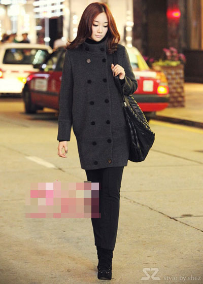 灰色外套,黑色双排扣设计,庄重典雅,不失女人味。