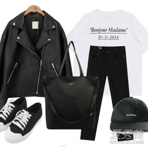 黑色皮夹克和牛仔裤也是很好的搭配。白色的大学t恤用于上半身,牛仔裤短裙用于创造高比例。这也是许多矮个子女孩喜欢的一种高层穿着方式,厚底鞋和信封袋被用来创造降低年龄的学术风格。