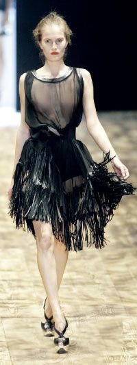 作为安特卫普的六位绅士之一,安女王似乎正在创作一部摇滚史诗。在她眼里,飘动的流苏实际上可能是“坚硬的”带有明显个人风格的2010春夏时装秀继续充斥着黑暗的潮流。硬朗的闪石马甲拖着长长的银色流苏,而同样结实的皮裙则充满了酷劲和顽强的哥特精神。