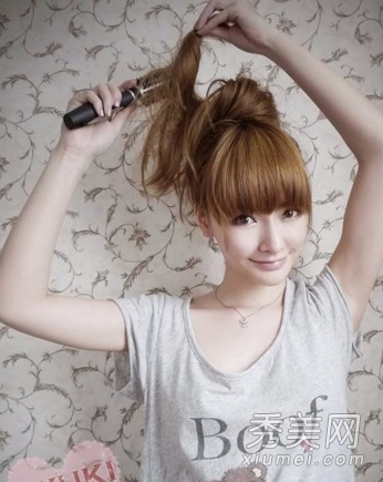 第一步:让我们先把头发梳下来,然后全部扎起来,但是越高越好,试着把它绑在我们的头顶。