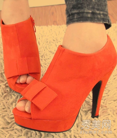 橙色蝴蝶结拉链厚底鱼嘴凉鞋,蝴蝶结通常是女生最喜欢的装饰品,俏皮、女性化,它的加入,让鞋子的吸引力瞬间上升。