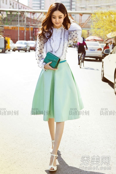 赵在拍摄街头电影时,穿着一件白色波点拼布衬衫,搭配一条甜美优雅的裙子,一头柔软的长卷发,看上去很柔软。他低着头,笑容里充满了小女人的娇羞和魅力,这非常令人兴奋。长袖衬衫配裙子是秋季的经典搭配。跟赵学着一起穿。