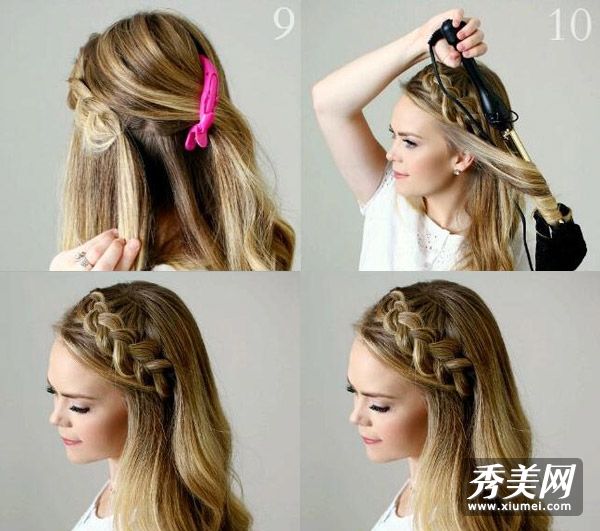 第八步:取出用夹子夹住的头发下面的发束,放入辫子中编织。