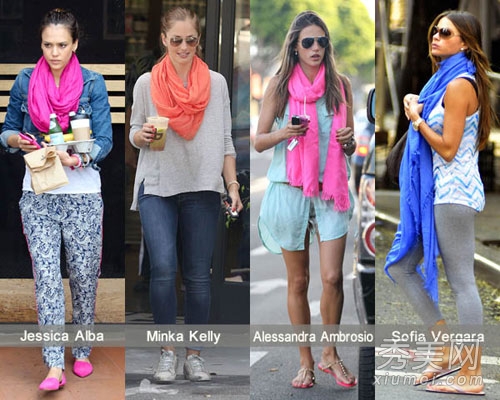 如果你想说时尚圈里的围巾爱好者,你必须提到甜心辣妈妈杰西卡·阿尔芭。从夏天到秋天,麻辣妈妈的围巾款式和风格差异很大。这个季节她更喜欢荧光围巾。粉红色不仅鲜艳,而且年轻。另外两位超级模特亚历山大·安布罗斯和索菲亚·维加拉也完美展示了这条围巾。