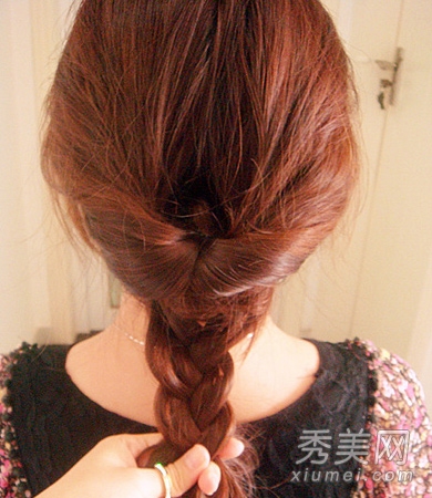 将下面剩下的头发编织成辫子的形状,用橡皮筋扎起来。