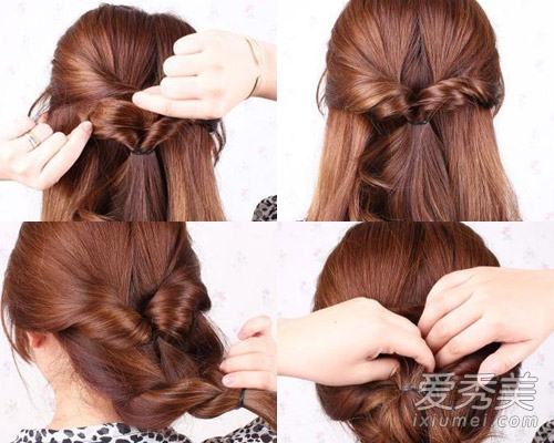第二步:去掉前额的刘海,如图所示向上扭转,用发夹固定。