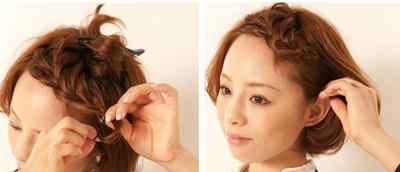第五步:始终使用与第四步相同的方法将头发编织下来。编织时,因为头发短,会有一些断了的头发。尽量小心,不要留下任何碎发。