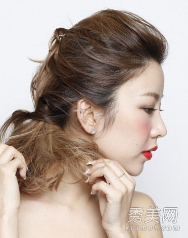 将左侧底部的头发包裹在发尾的右侧,用夹子固定,用双手轻轻拉发尾使其蓬松,并整理头发使发型更加立体。