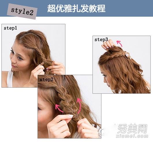 第一步:从额头上取下弧形发束,编织成一条紧密的三股辫子。