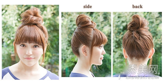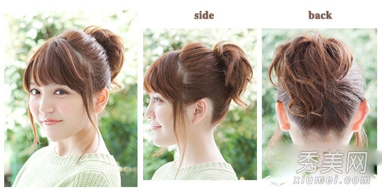 刘海带内扣突出姐姐的大眼睛,搭配鬓角修饰脸型,有瘦脸的效果,而高耸的发髻显示个性的趋势,同时有拉高的效果,所以喜欢它的姐姐应该快来学习。