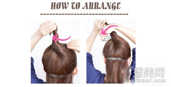 第四步:用黑色发夹将小发束固定在大发束旁边,然后将发尾与其他头发融合。