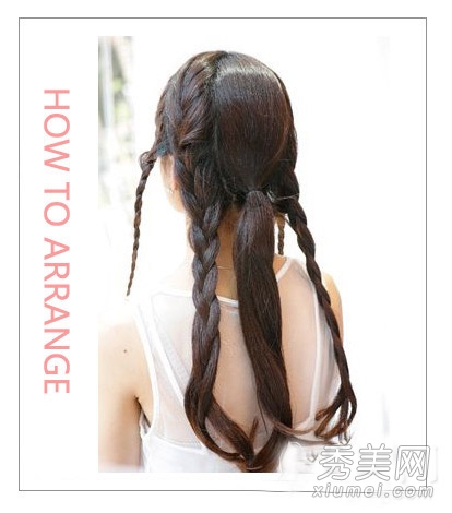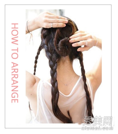 第四步:将刘海处的两条辫子交叉成发带形状,并用发夹固定。