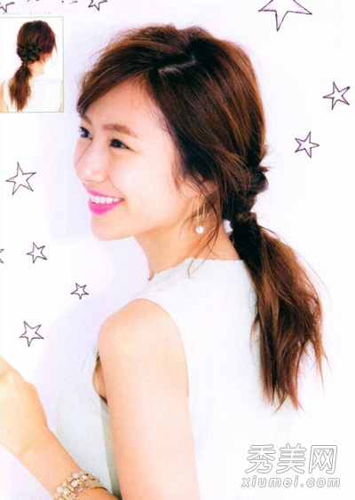 第三步:最后,将头发分成三束,换两三次发辫,增加发髻的蓬松感,最后用橡皮筋固定。