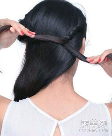 第七步:将发辫包在脑后较少的一侧,将发辫像橡皮筋一样包在脑后,保持脑后整齐。