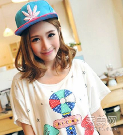 甜心的发型,中等烫发,柔软的卷发,淡黄色的头发颜色,清新俏皮,戴着帽子和草绿色外套,Loli感觉清新饱满。